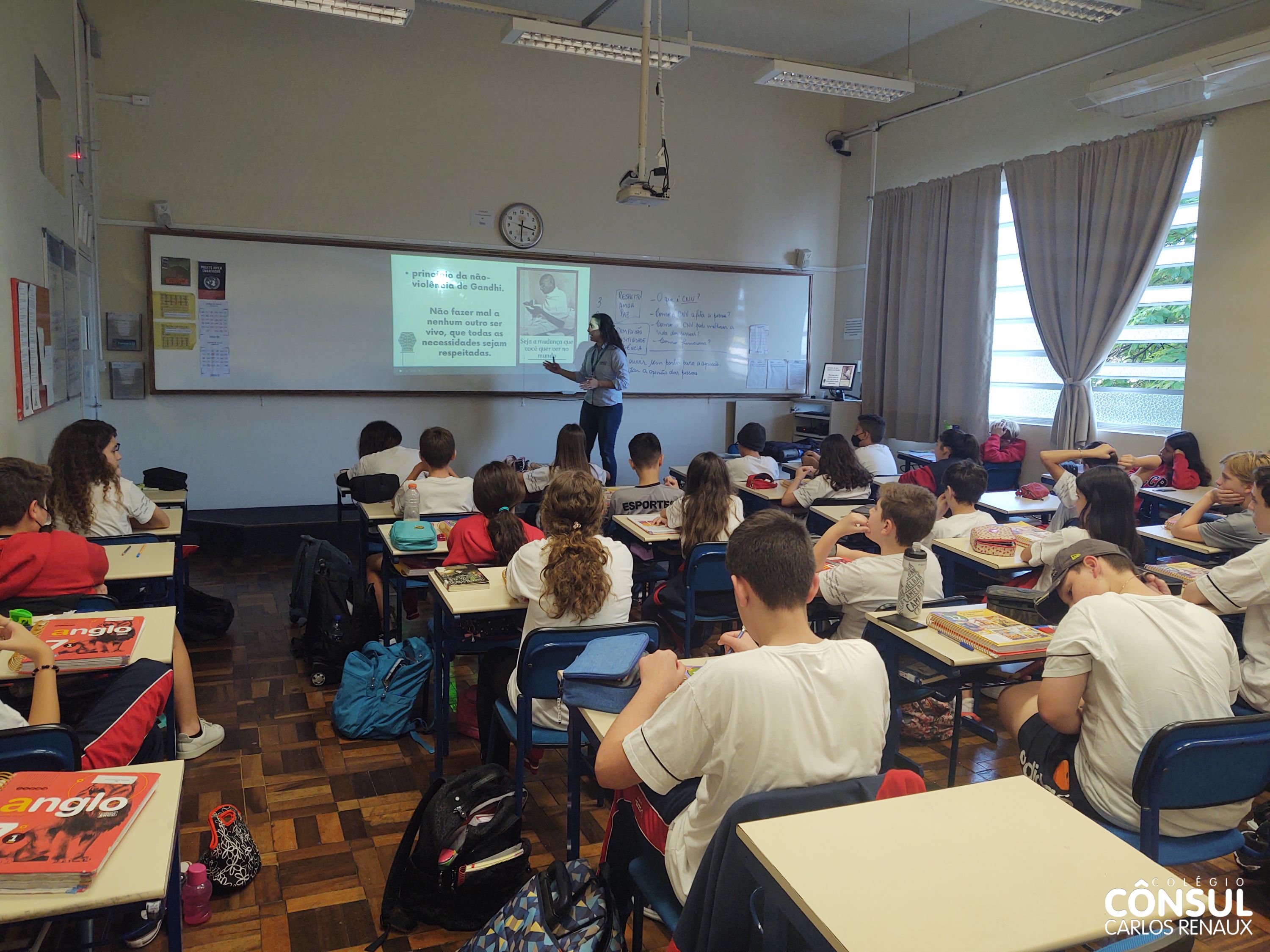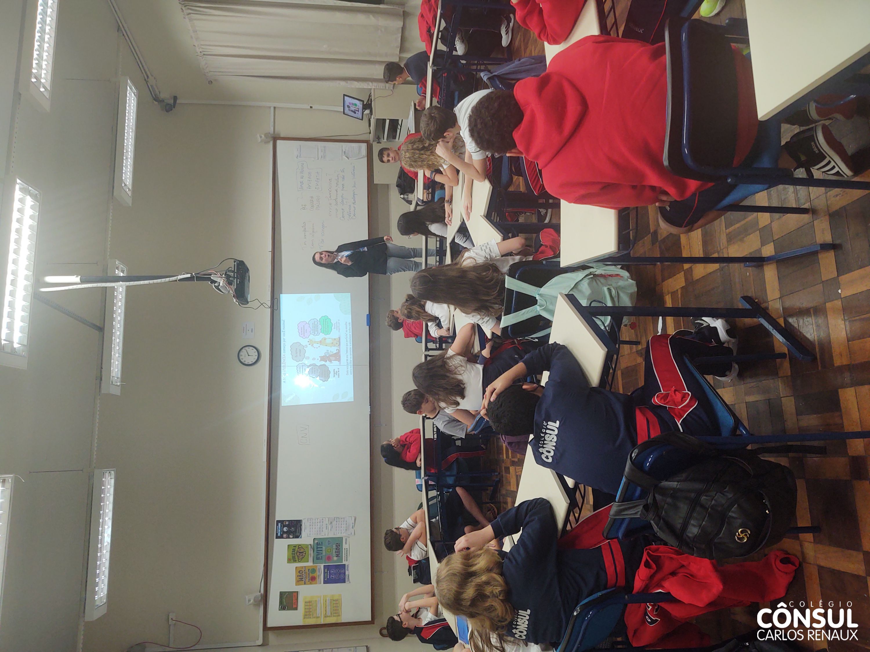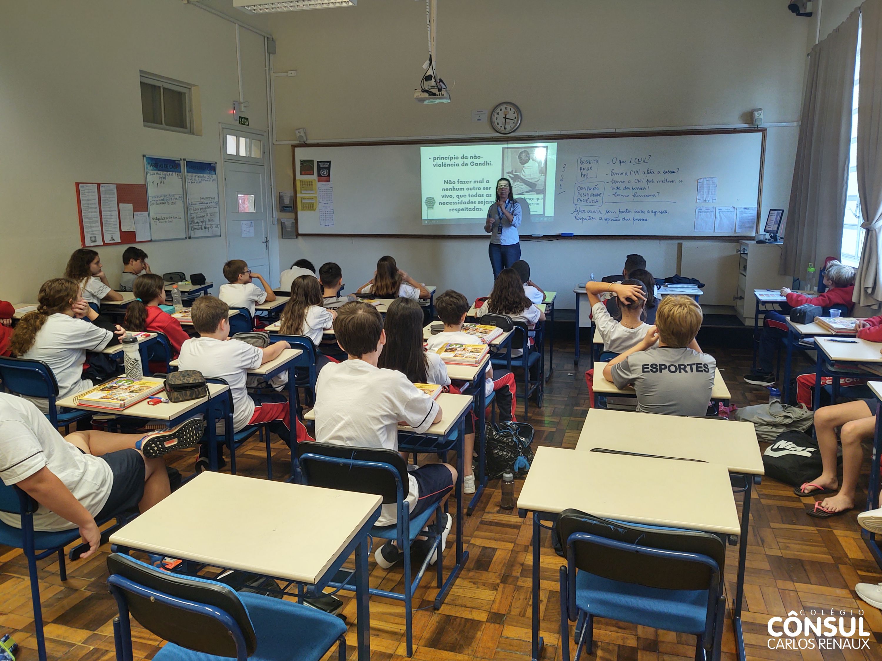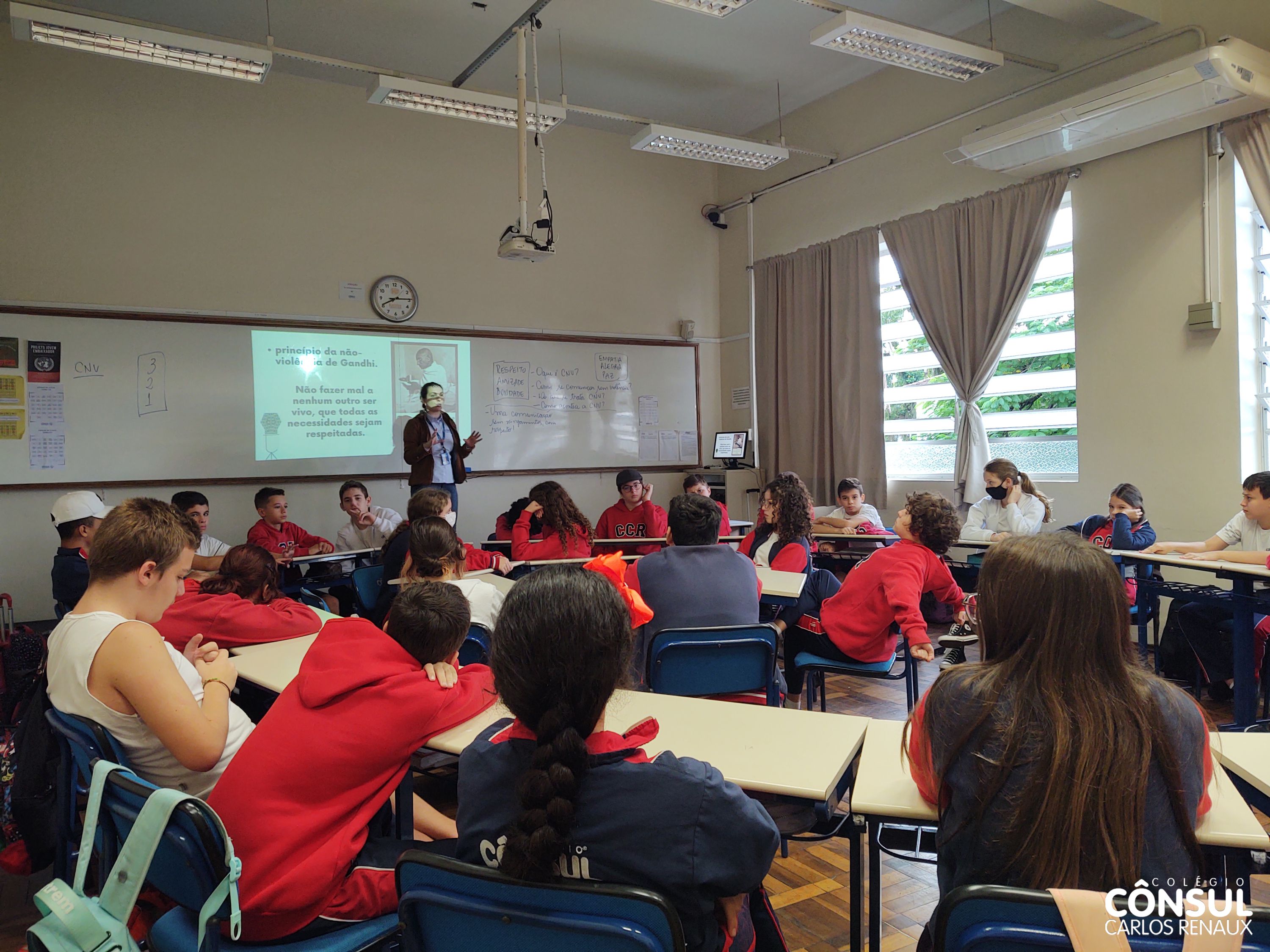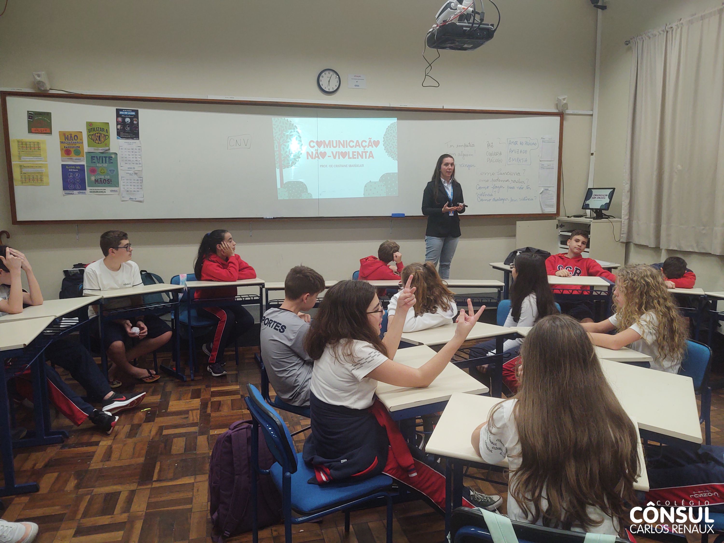 Com esse propósito de conhecer e desenvolver a Comunicação Não Violenta, uma atividade foi realizada pela orientadora educacional Cristiane Sbardelati com os estudantes dos sétimos anos do Ensino Fundamental II. A atividade foi realizada em parceria com o professor Nathan Krieger e vai ao encontro com os temas trabalhados na disciplina de Ensino Religioso.