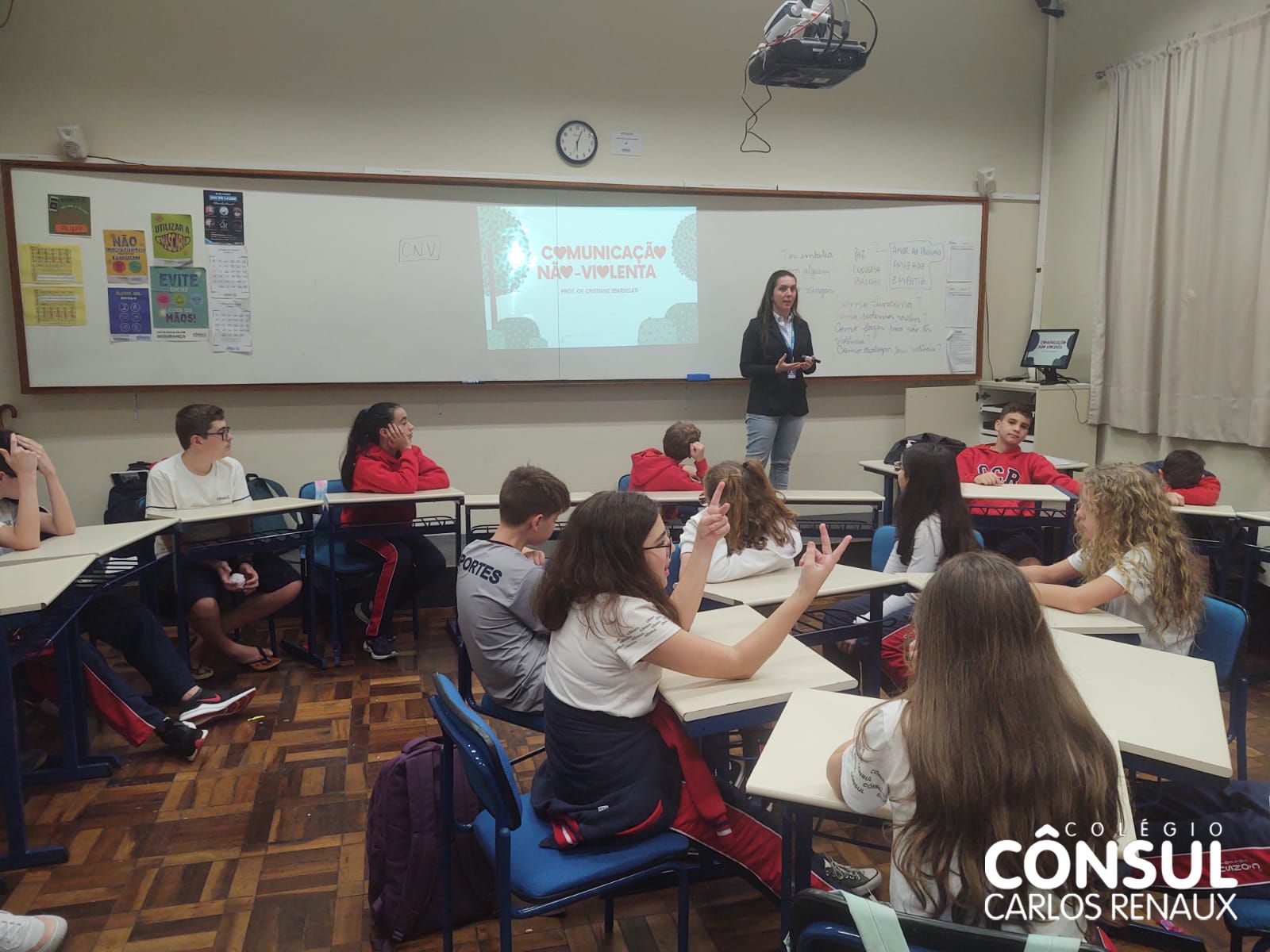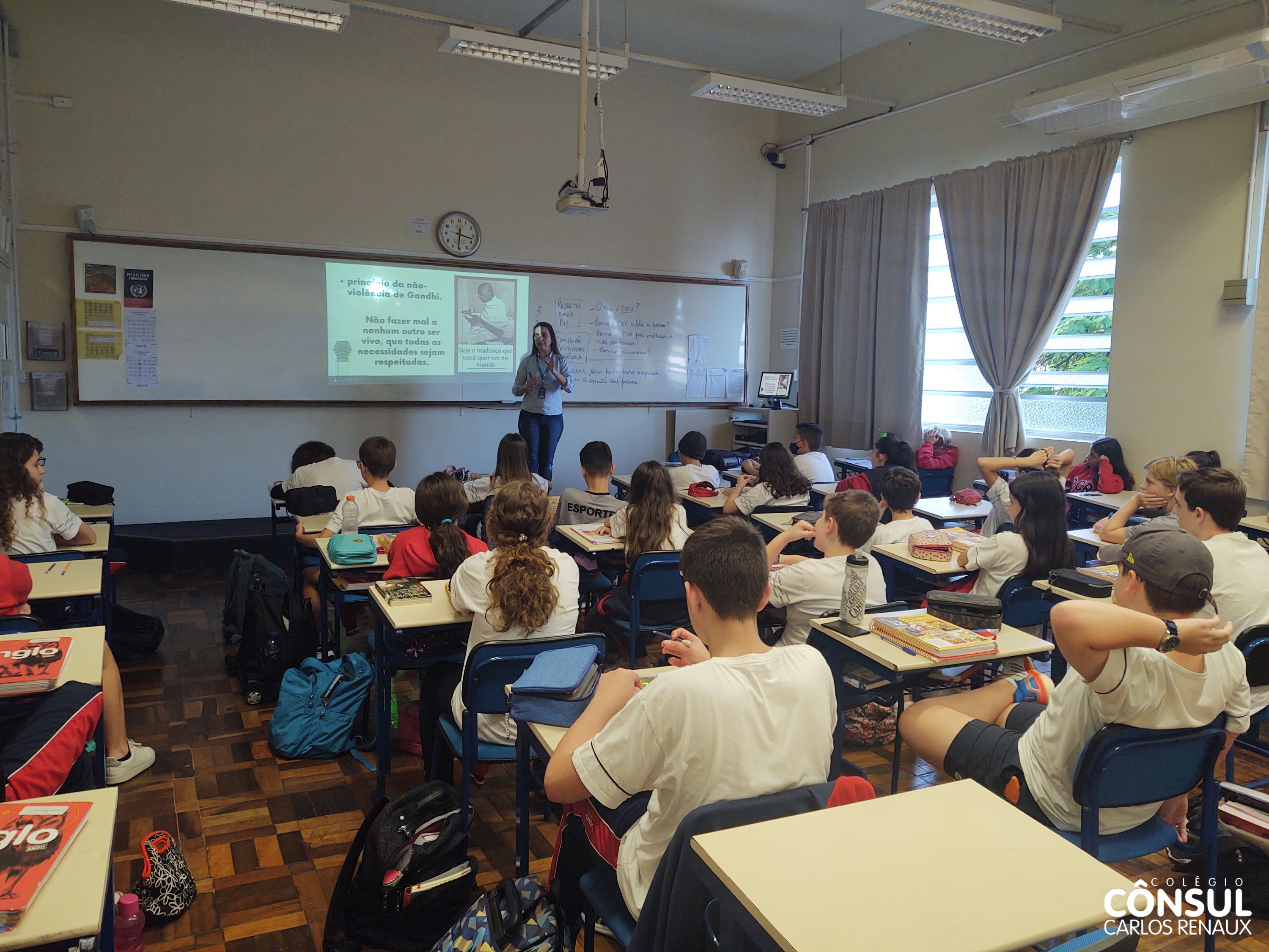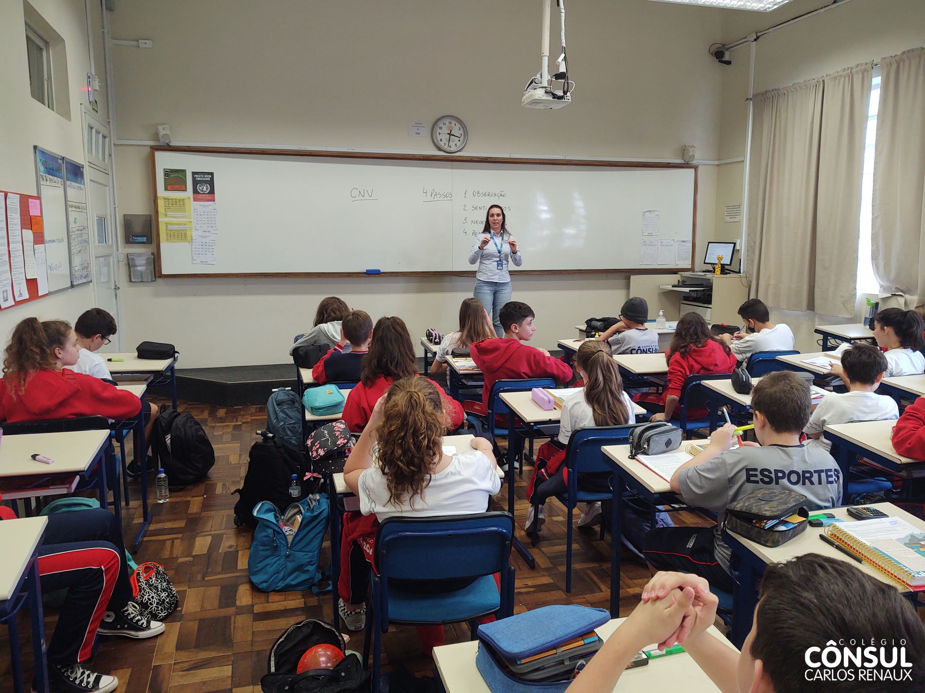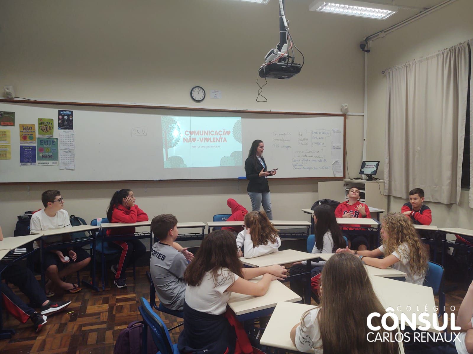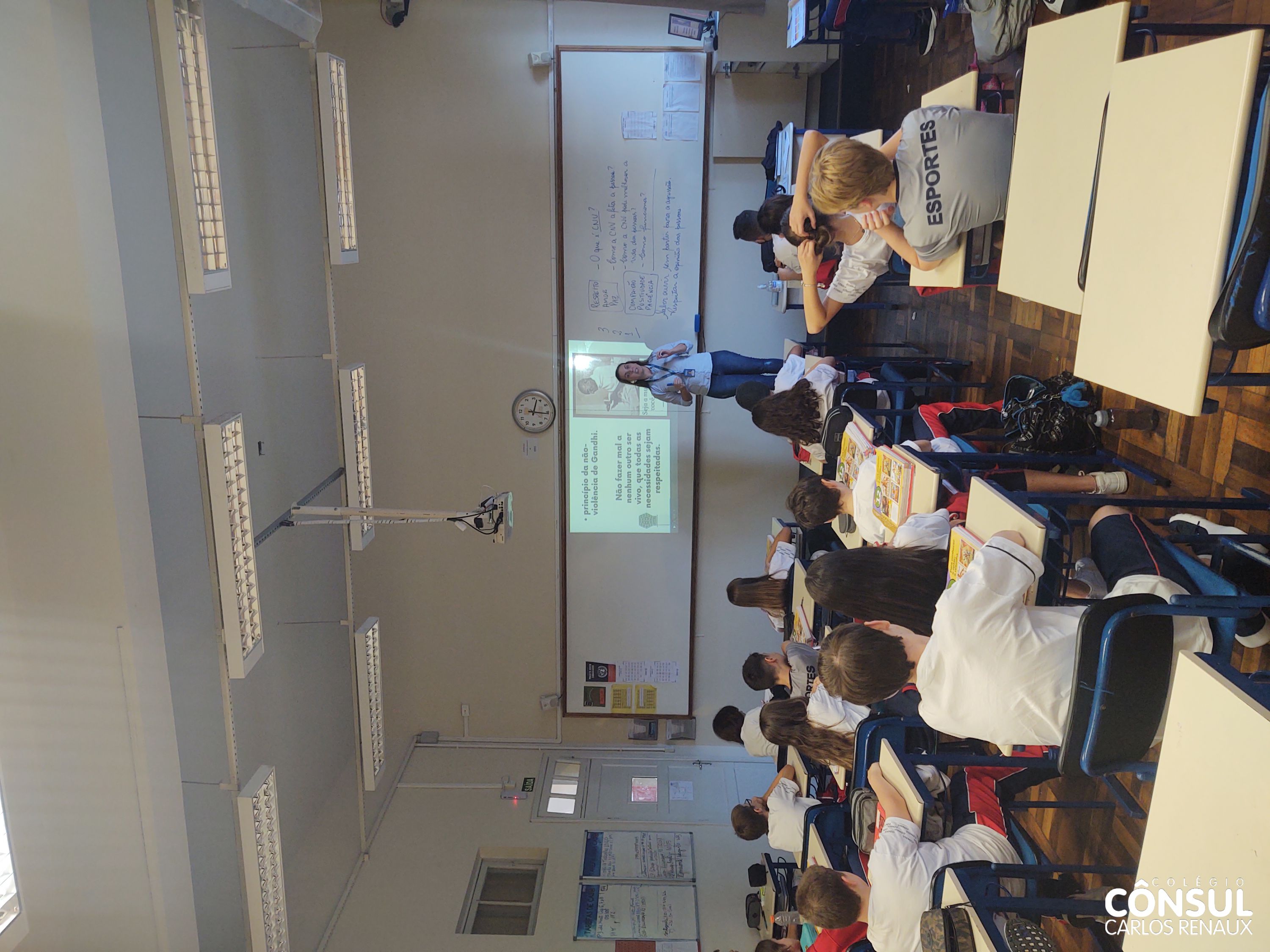 Com esse propósito de conhecer e desenvolver a Comunicação Não Violenta, uma atividade foi realizada pela orientadora educacional Cristiane Sbardelati com os estudantes dos sétimos anos do Ensino Fundamental II. A atividade foi realizada em parceria com o professor Nathan Krieger e vai ao encontro com os temas trabalhados na disciplina de Ensino Religioso.