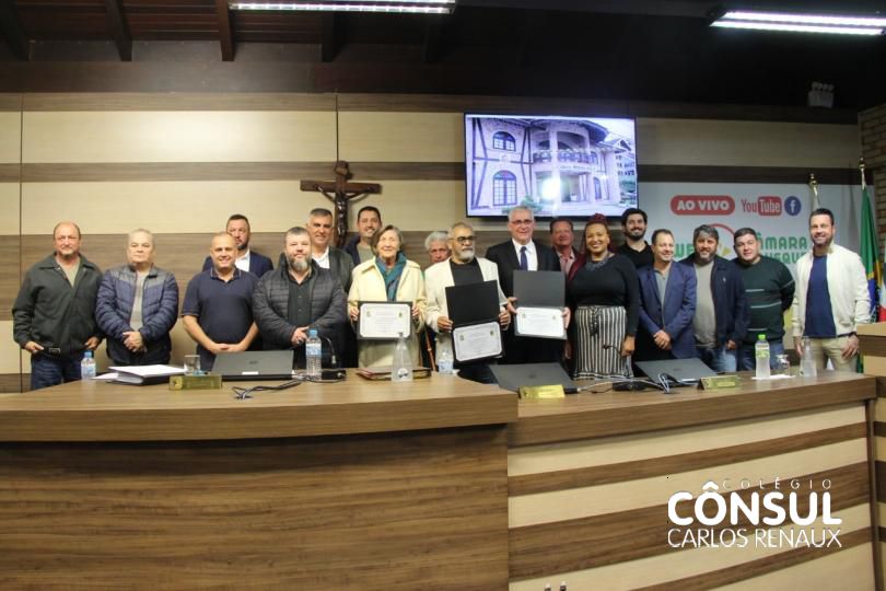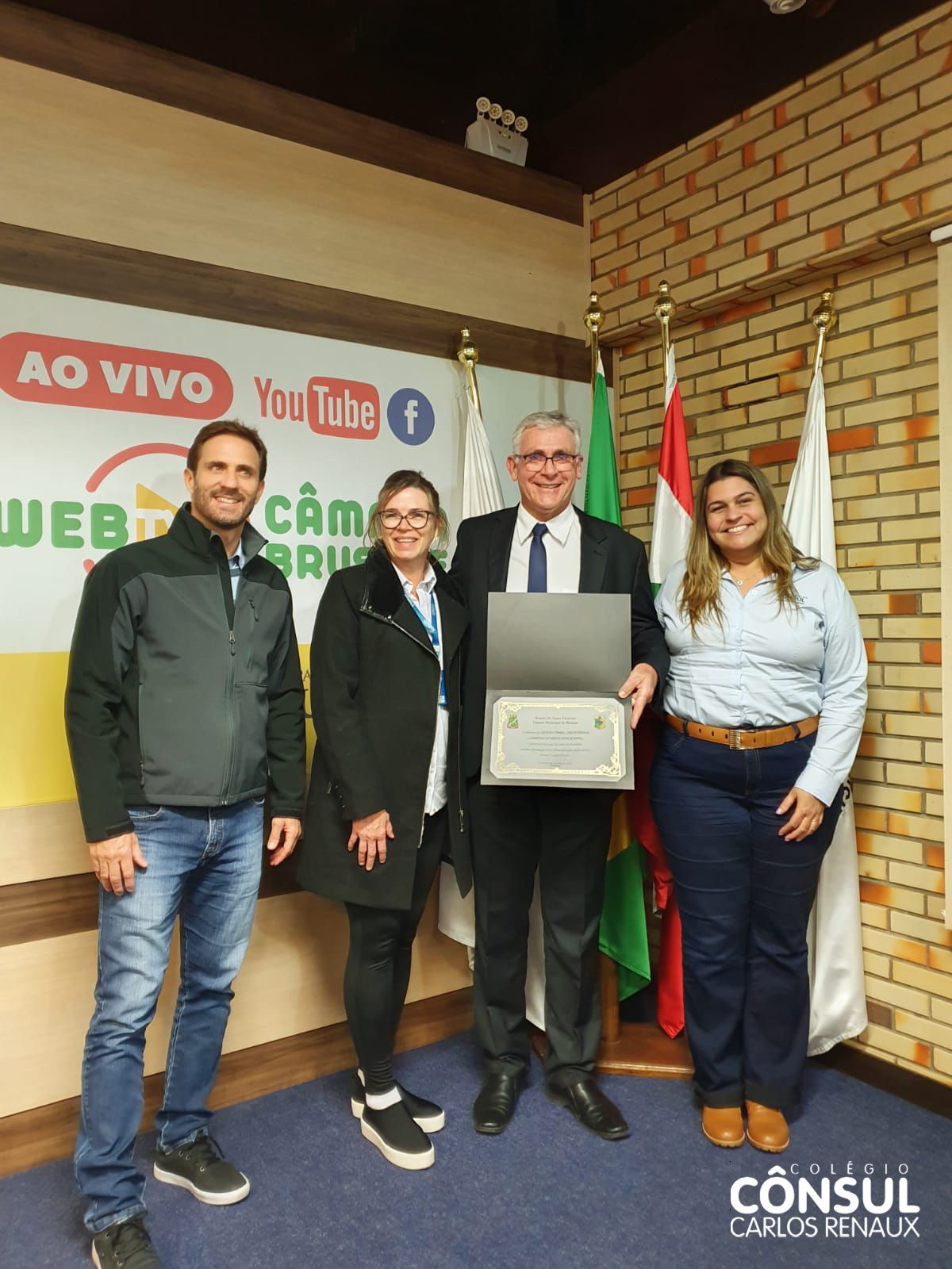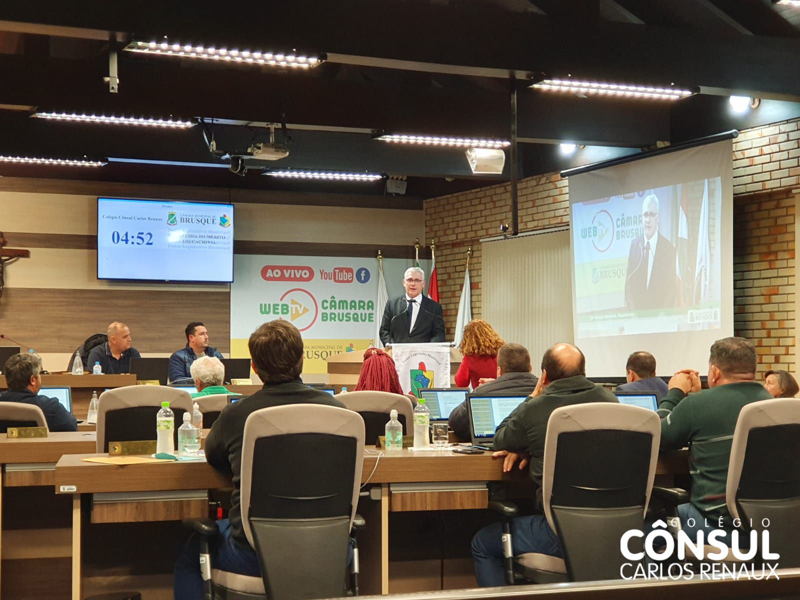 Na noite desta terça-feira, 21/06, o Colégio Cônsul recebeu a Comenda do Mérito Educacional, como distinção pública pelo aniversário de 150 anos de atividades na formação e profissionalização da juventude. O diretor Otto Hermann Grimm representou a instituição na Reunião Ordinária da Câmara de Vereadores de Brusque e prestigiaram esse momento especial o Sr. Marcus Shlösser, presidente da Fundação Educacional Luterana e integrantes da equipe pedagógica.