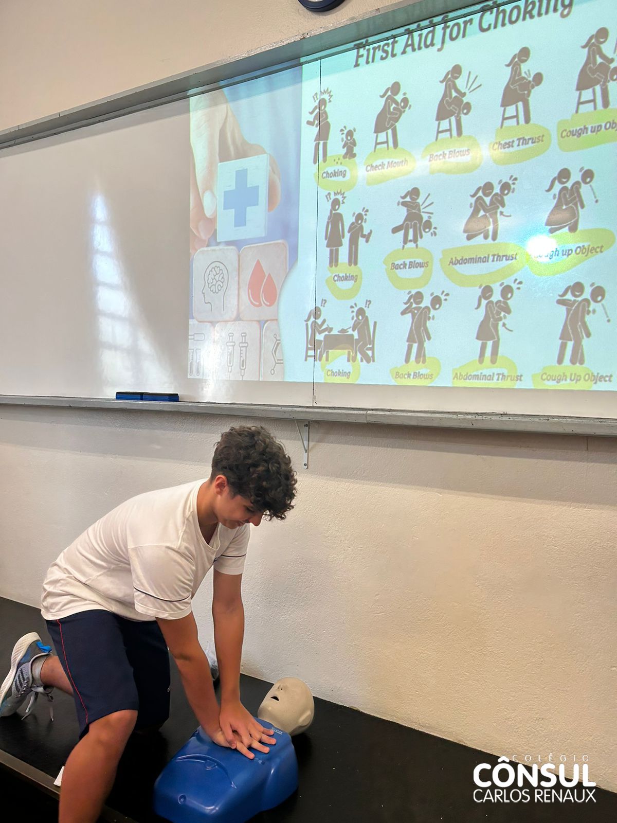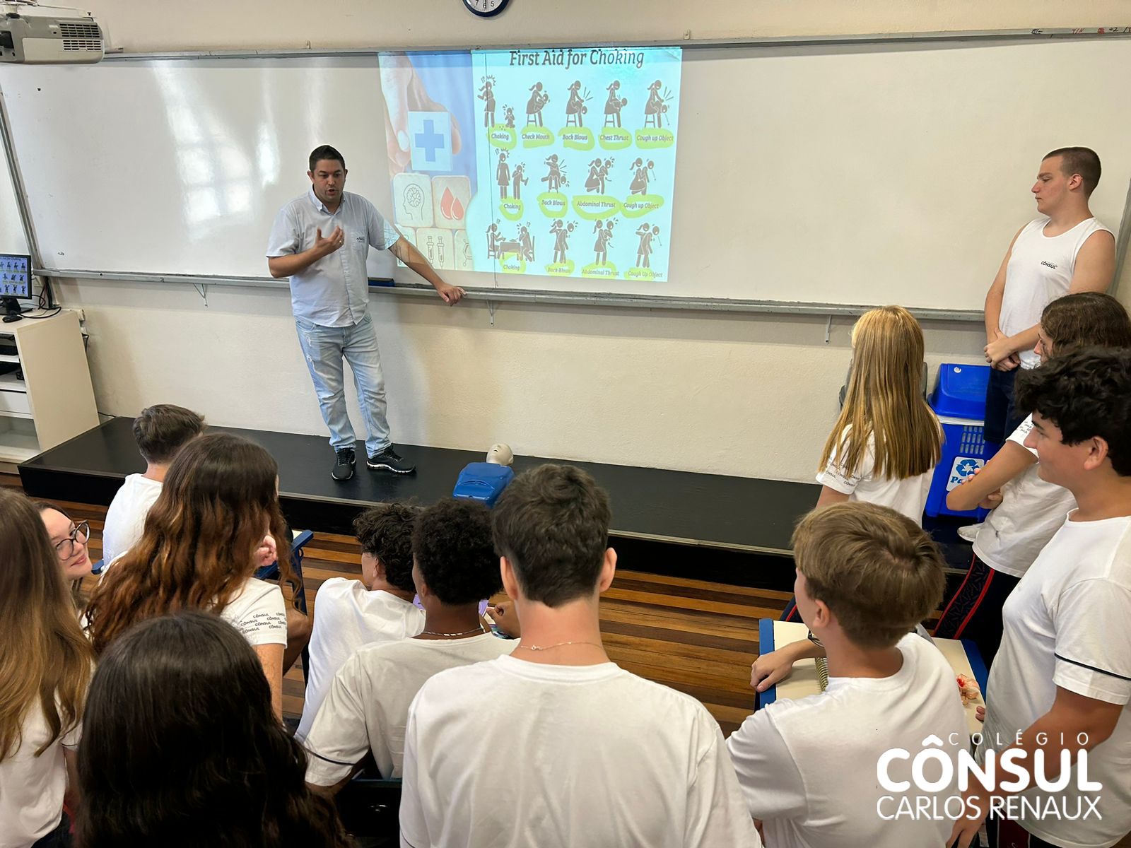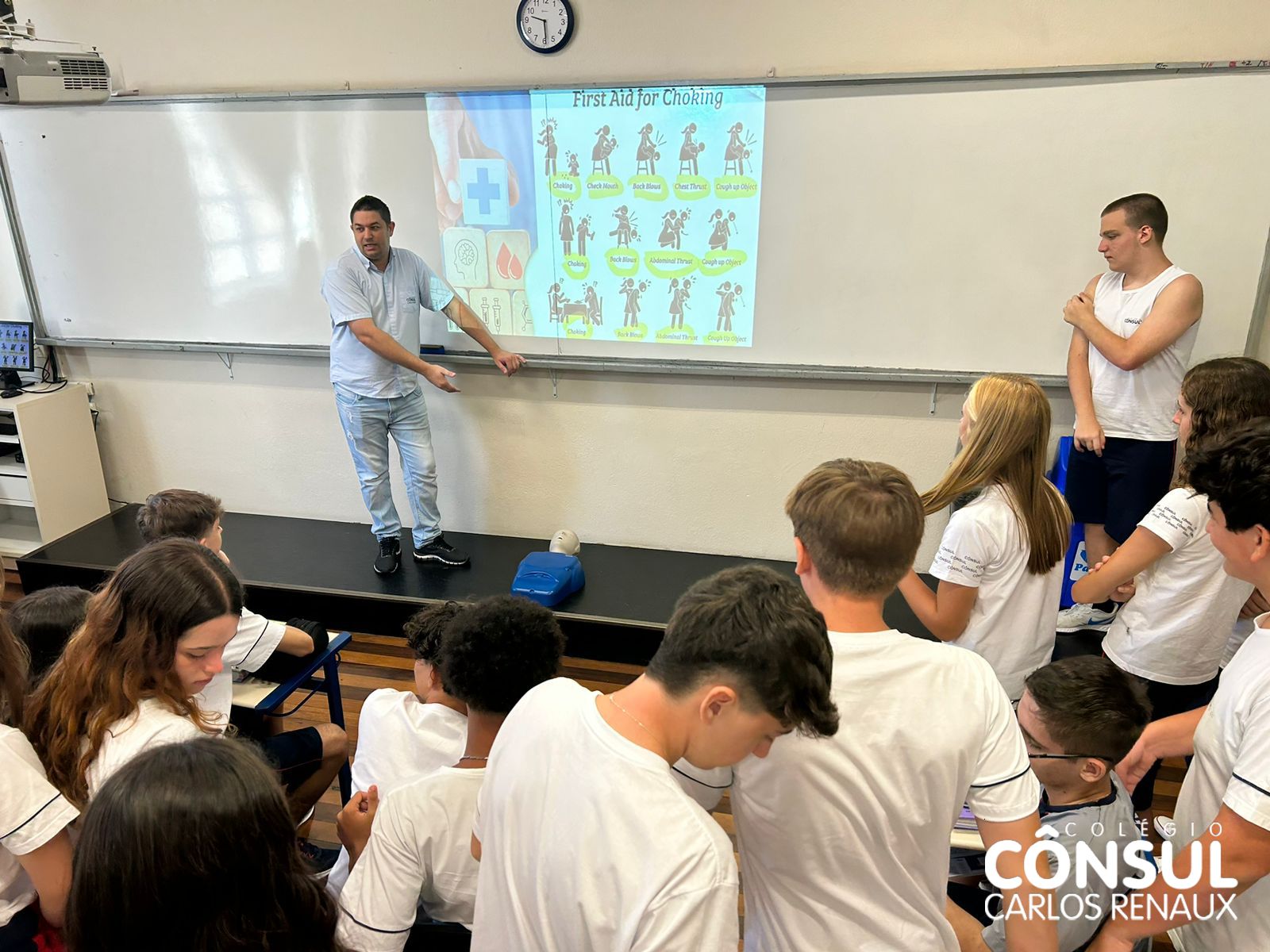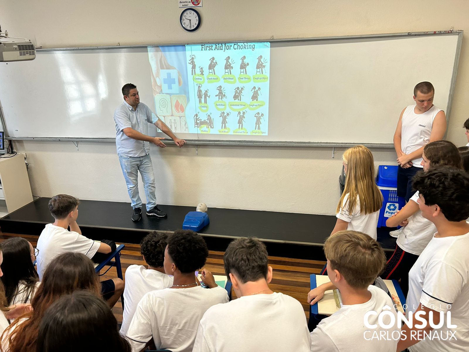 A iniciativa de oferecer o treinamento aos estudantes do 8º ano ao Terceirão partiu das professoras de Inglês, que integraram a parte prática com vocabulário e expressões em ambas as línguas. Compartilhando manobras em casos de engasgamento, abordando o passo a passo da manobra Heimlich, capacitando-os para lidar com situações de emergência.