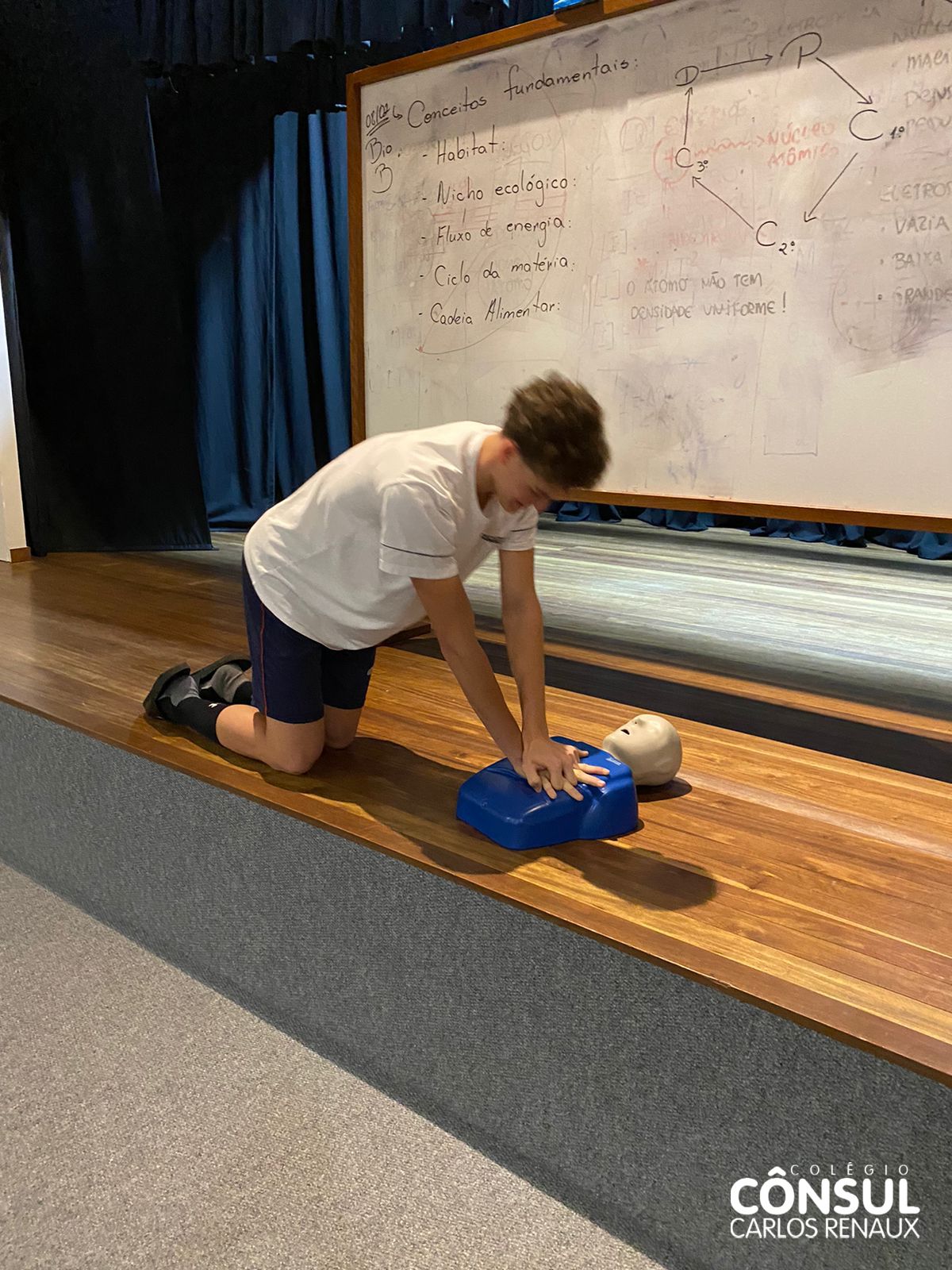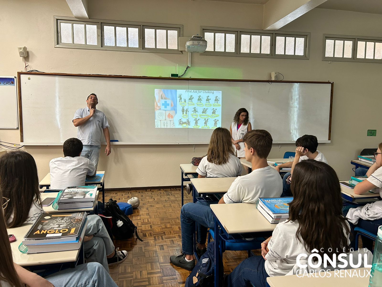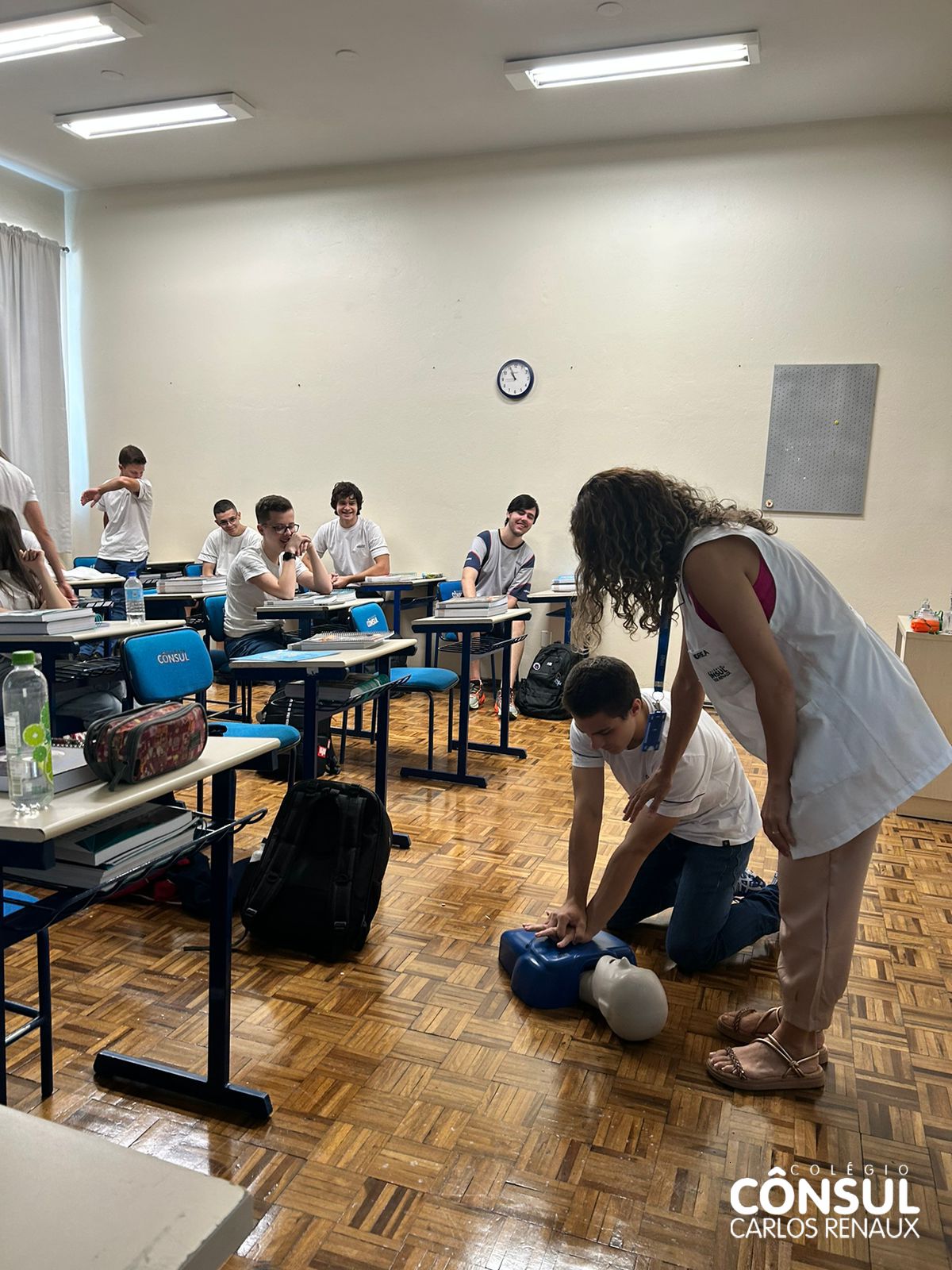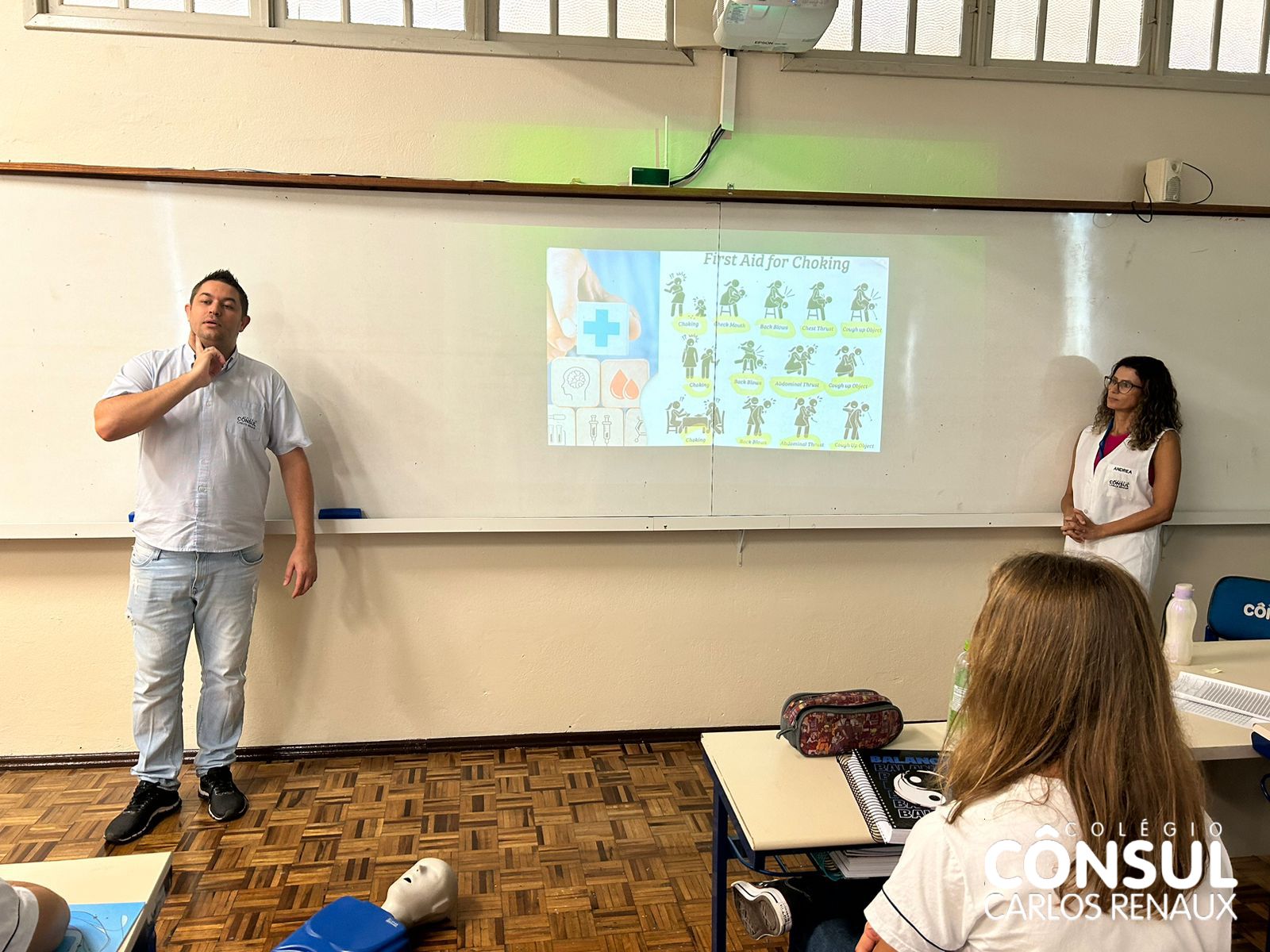 A iniciativa de oferecer o treinamento aos estudantes do 8º ano ao Terceirão partiu das professoras de Inglês, que integraram a parte prática com vocabulário e expressões em ambas as línguas. Compartilhando manobras em casos de engasgamento, abordando o passo a passo da manobra Heimlich, capacitando-os para lidar com situações de emergência.